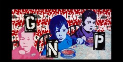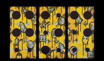 CONQUEST , oil on canvas , 4' x 5' HEAR NO EVIL, SEE NO EVIL, SPEAK NO EVIL , acrylic on canvas , 3 panels , 2' x 4' each CHOP , acrylic on canvas , 30" x 40" OBJECTIVE , oil on canvas , 2' x 4' SPOON FED , acrylic & mixed meadia on canvas , 2' x 3 ' ALLMODCONS . acrylic on canvas , 3 panels , 1' x 2' each DESCENT , mixed media on canvas , 4' x 4' PANTHER , acrylic, gold & silver leaf on canvas , 2' x 4' VOID , acrylic on canvas , 1' x 2' 09 , acrylic on canvas , 1' x 2' ODE , acrylic, gold & silver leaf on canvas, 1' x 2' SNOW JOB , acrylic & glass beads on canvas , 8" x 10"